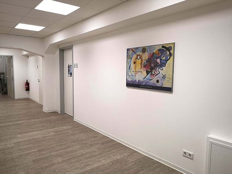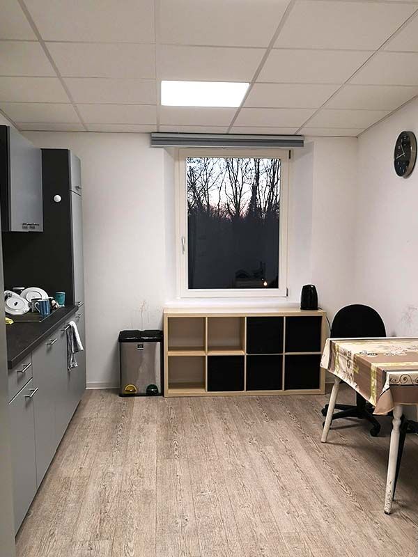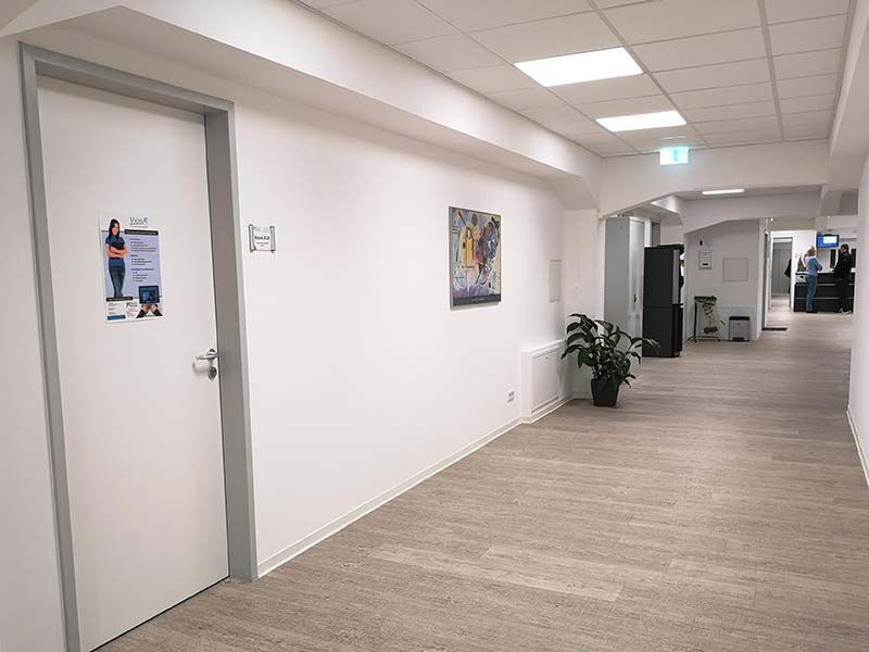 Über den hohen großen Eingangsbereich erreichen Sie Ihre modernen und freundlichen Schulungsräume im ersten Stock – bei Bedarf auch mit dem Fahrstuhl. Sie sind behindertengerecht und mit Fußbodenheizung ausgestattet. Die großen Fenster lassen viel Licht herein. Der Blick geht auf das historische denkmalgeschützte Arrestgebäude. Ihre Unterrichtszeit liegt zwischen 8 und 16:15 Uhr, aber zwischendurch muss auch mal die eine oder andere Pause sein, in der Sie sich in den Pausenräumen entspannen können. In der Küche stehen Ihnen Wasserkocher, Kaffeemaschine, Mikrowelle und Kühlschrank zur Verfügung.